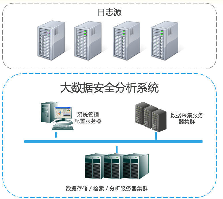日志大數(shù)據(jù)系統(tǒng)從物理架構(gòu)上應(yīng)分為:數(shù)據(jù)采集集群、數(shù)據(jù)存儲(chǔ)檢索安全分析集群、系統(tǒng)配置管理服務(wù)器三部分組成,物理架構(gòu)示意圖如下: