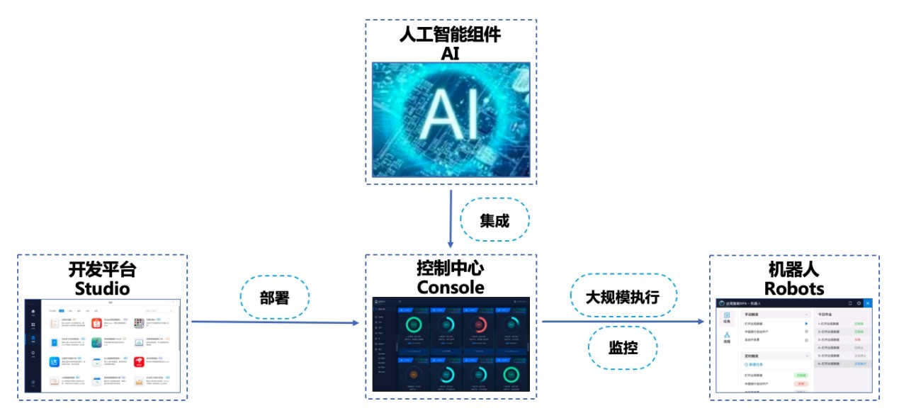 中科RPA由人工智能組件、開發(fā)平臺、控制中心和機器人四部分組成,相互間無縫協(xié)作,提供高性能、低成本和極致用戶體驗的端到端解決方案。