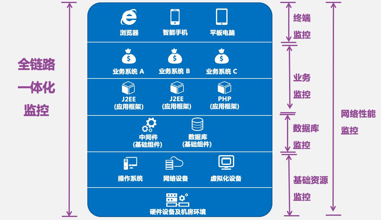 中科應(yīng)用性能監(jiān)控系統(tǒng)(APM)是集應(yīng)用性能監(jiān)控和業(yè)務(wù)分析為一體的整體解決方案,是業(yè)界唯一做到將輕量級代碼探針和網(wǎng)絡(luò)抓包技術(shù)相結(jié)合的產(chǎn)品,能幫助用戶將IT和業(yè)務(wù)聯(lián)系起來進(jìn)行監(jiān)控管理,從而實(shí)現(xiàn)從業(yè)務(wù)角度開展運(yùn)維工作,實(shí)現(xiàn)運(yùn)維和業(yè)務(wù)的雙向融合,以業(yè)務(wù)數(shù)據(jù)和應(yīng)用性能監(jiān)控?cái)?shù)據(jù)為基礎(chǔ),通過大數(shù)據(jù)采集、處理、分析、預(yù)測,呈現(xiàn)可視化圖表,并支持產(chǎn)品組件化、大屏化和定制化。